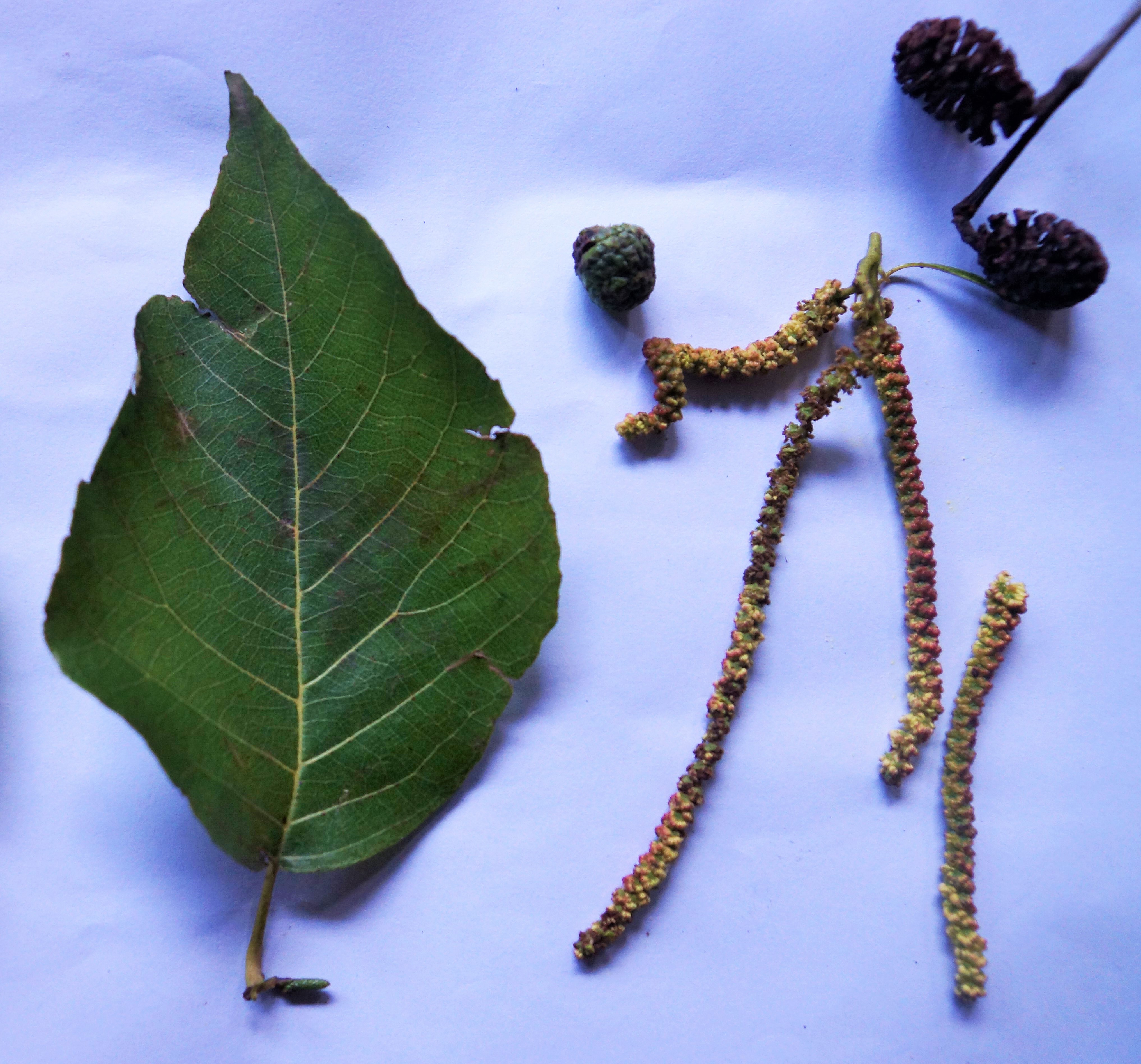 Bark dark gray and ridged. Leaves simple heart shaped, glabrous to hairy. Male flower in catkins up to 20 cm long, yellow-green. Female flowers in woody cones. Fruit a nut, winged.