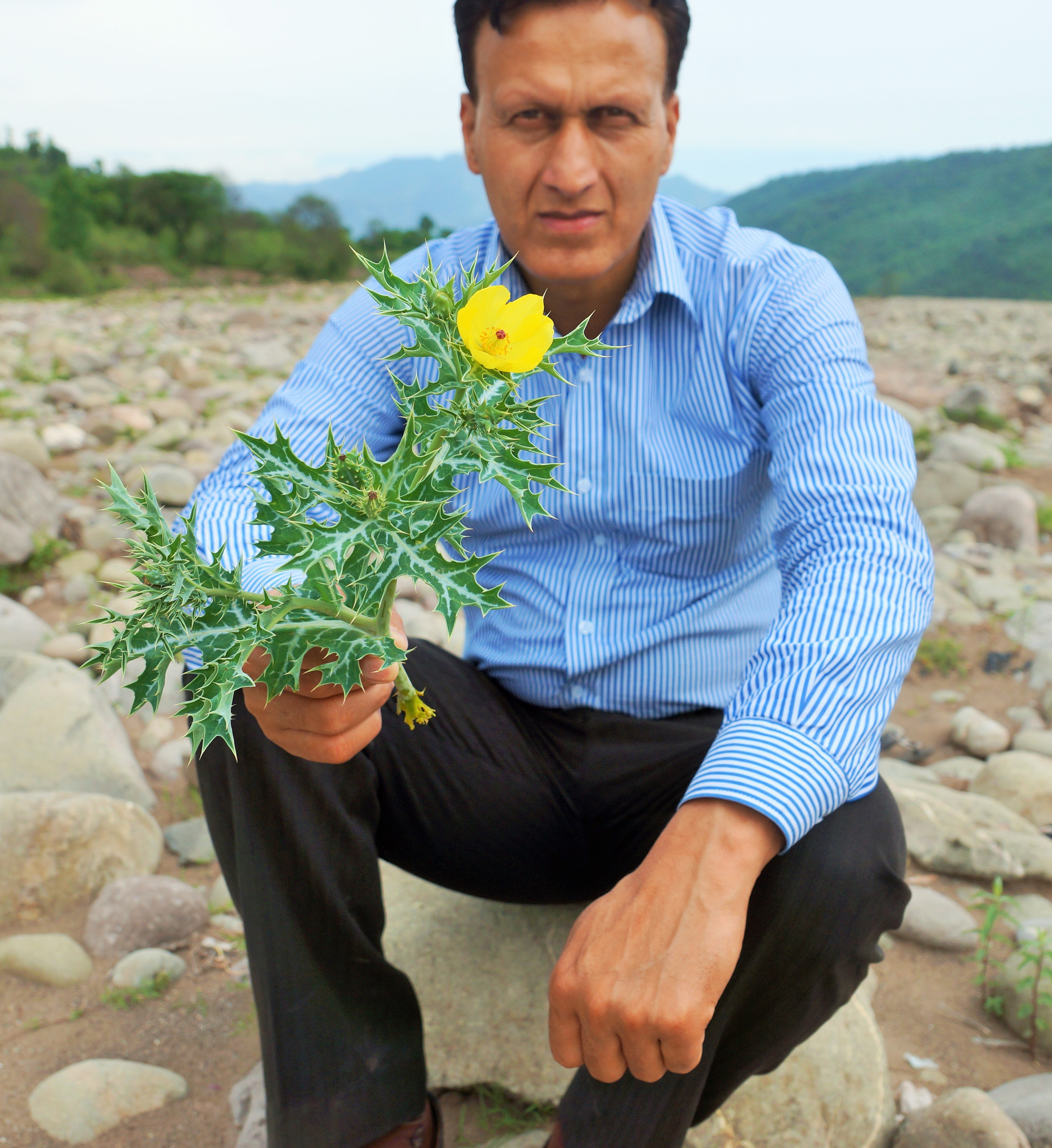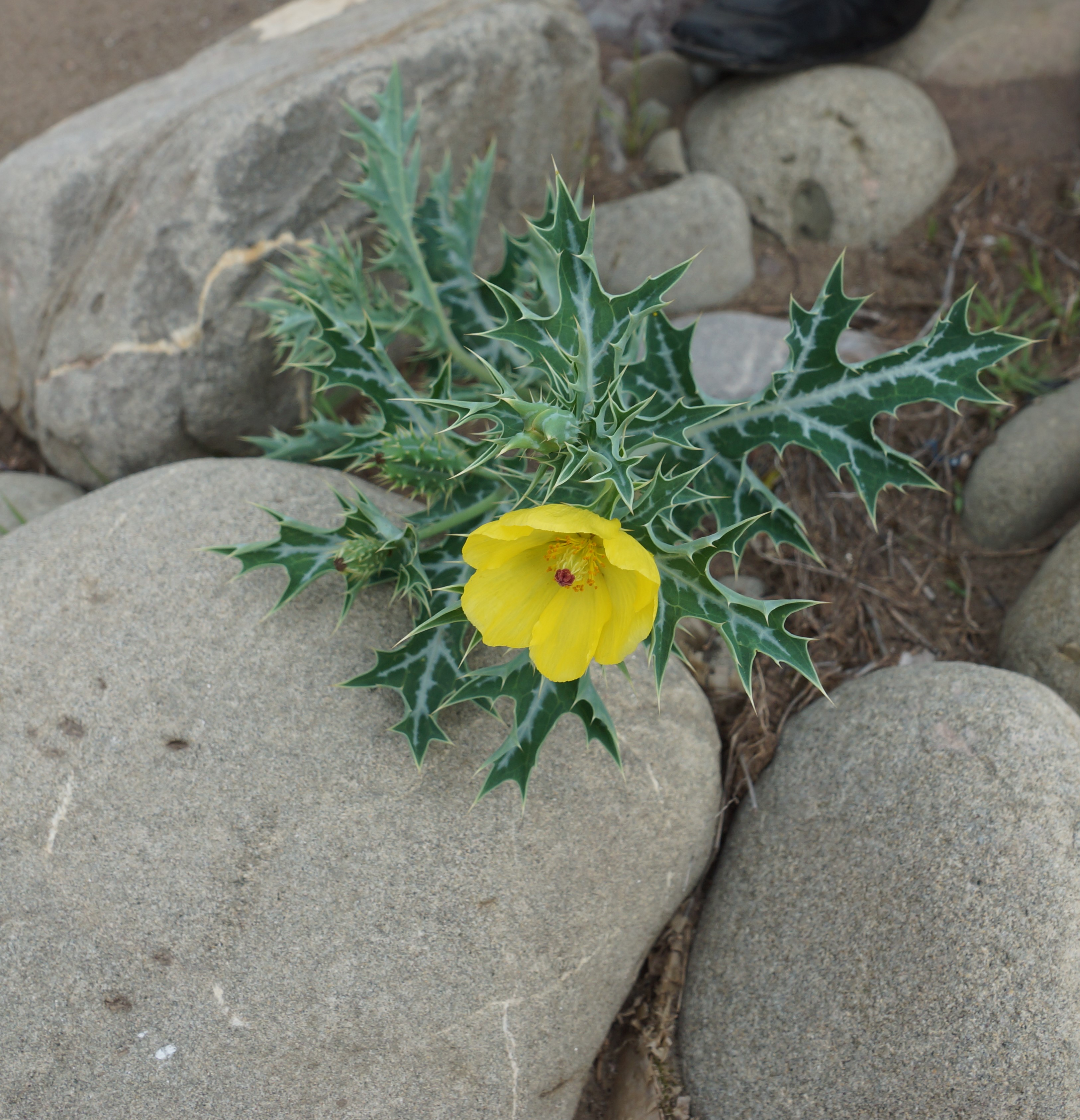 Leaves alternate, elliptic-oblong, pinnatifid, variegated green and white, dentate, margin prickly. Inflorescence terminal, solitary. Flower sessile, yellow, 3-6cm in diameter. Sepals prickly outside. Petals 4-6, obovate, bright yellow. Fruit a capsule, oblong or elliptic-oblong with ribs, prickly, blackish brown, dehiscing by valves.