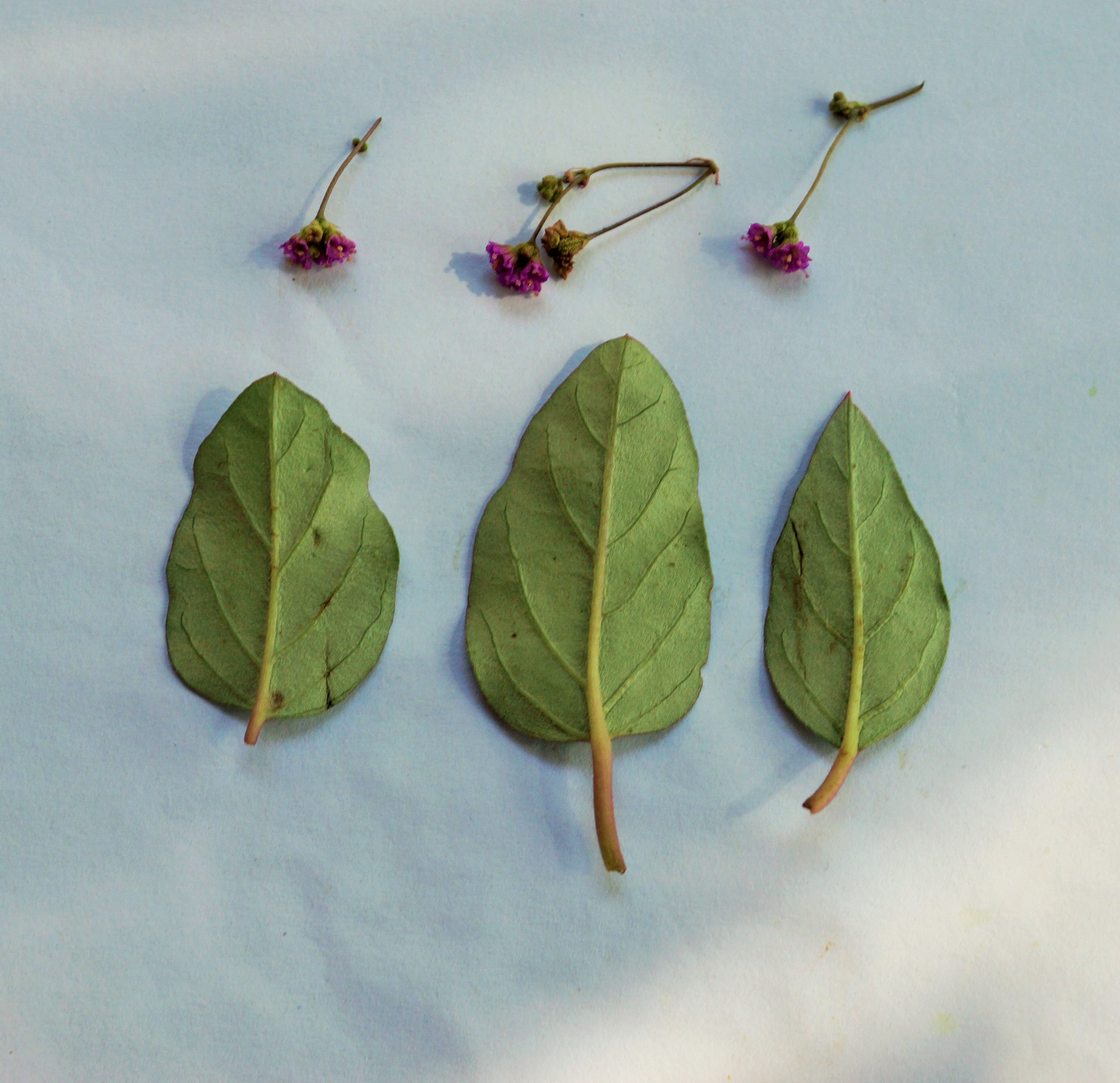 Stem and branches reddish. Leaves simple, ovate to oblong, margin wavy, whitish on undersurface. Inflorescence in axillary panicles. Flower pinkish-mauve, 3mm long. Fruit club like, 5-ribbed, glandular and papillose.