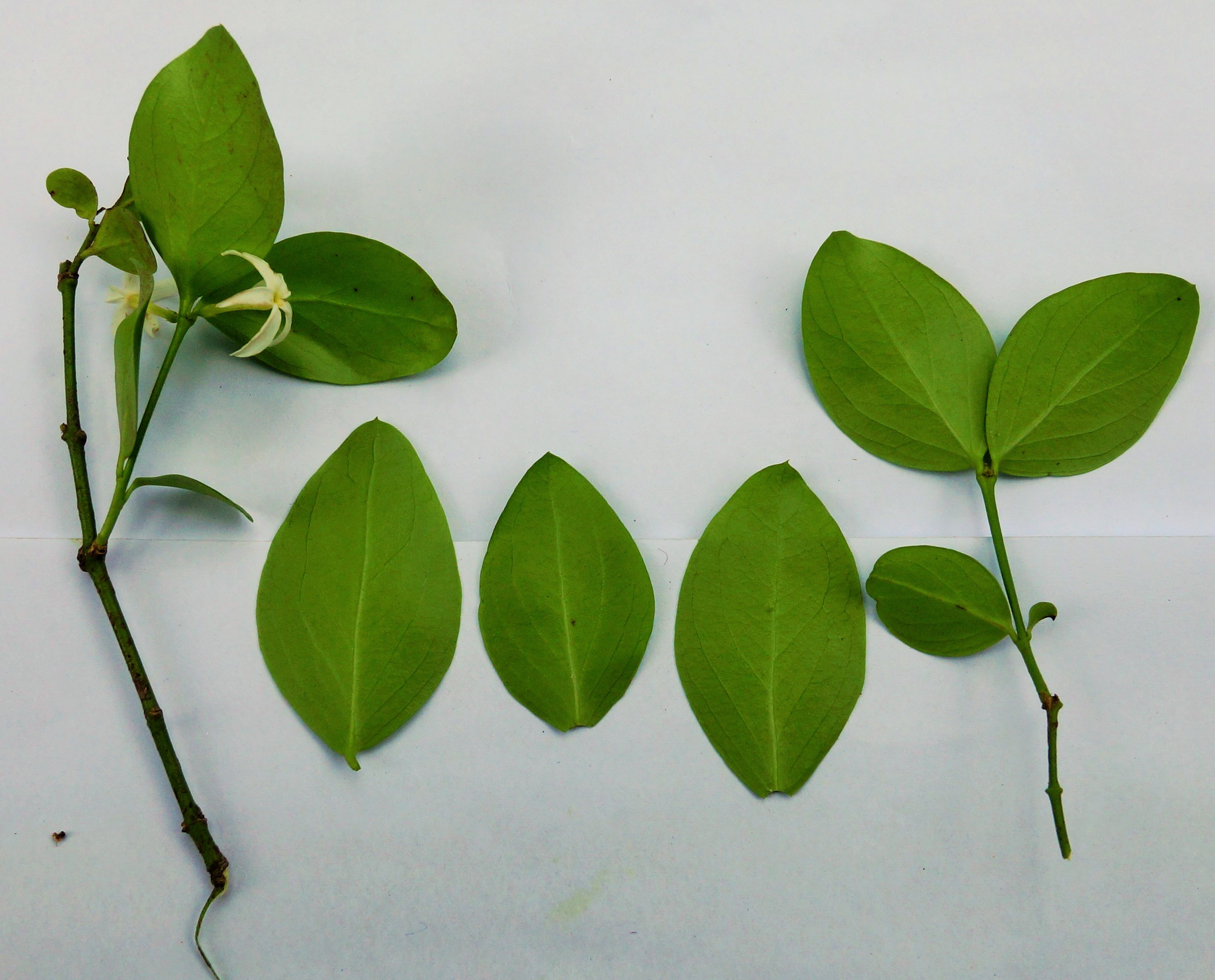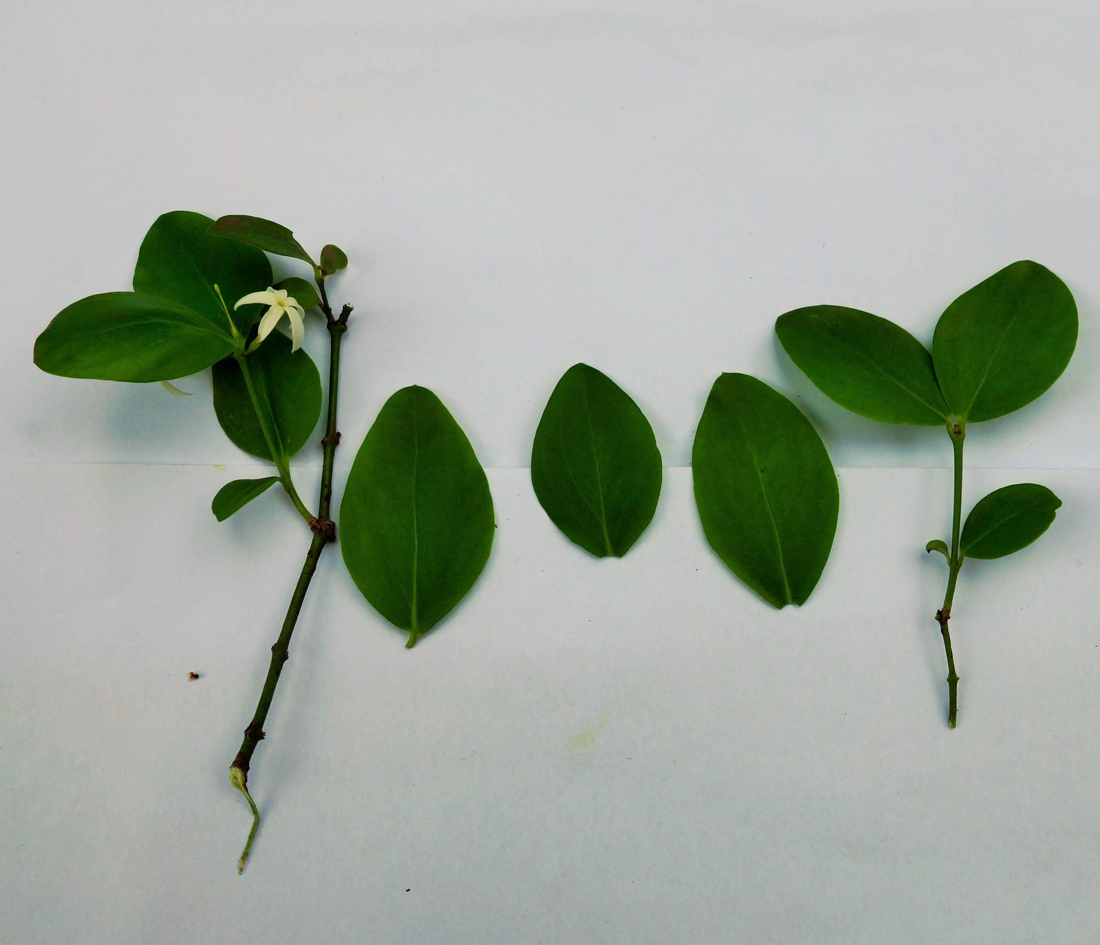 Young shoot with milky juice. Leaf simple, opposite, elliptic, ovate or round, shinning, green above. Inflorescence in terminal cymes. Flower white or light rose, sweet scented, 2cm across. Calyx lobes lanceolate. Corolla tube slender. Fruit a berry, elliptic-oblong, dark purple when ripe, with white milky juice.