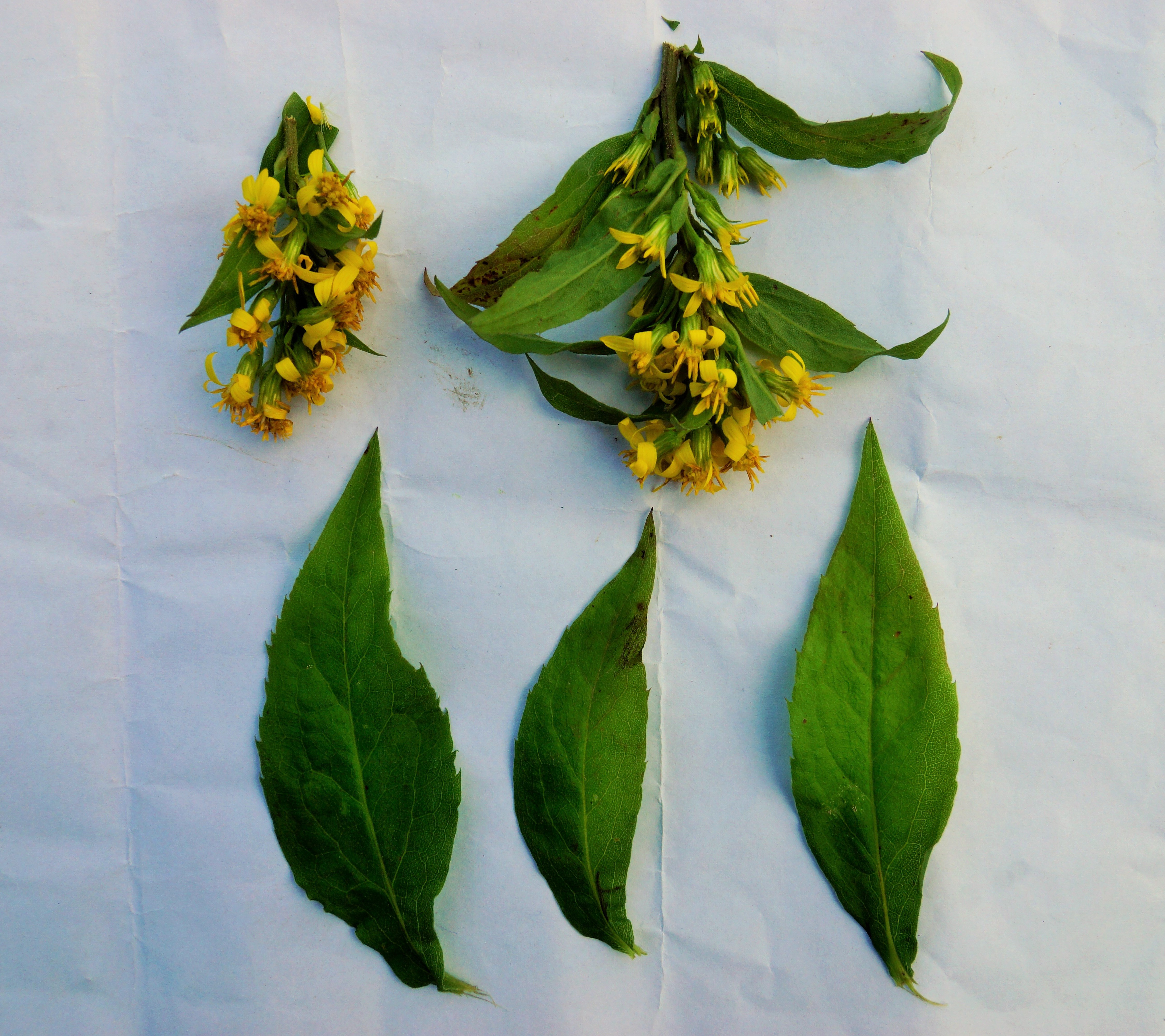 Leaves simple, lanceolate, aromatic, acute, subglabrous, lower leaves stalked, 8-13cm, toothed, the upper sessile, smaller, narrower and entire. Inflorescence composed of terminal panicles or racemes. Flower mustard yellow. Ray floret strap-shaped, spreading while disc floret tubular. Fruit an achene, pappus long, rough with brownish-white hairs.