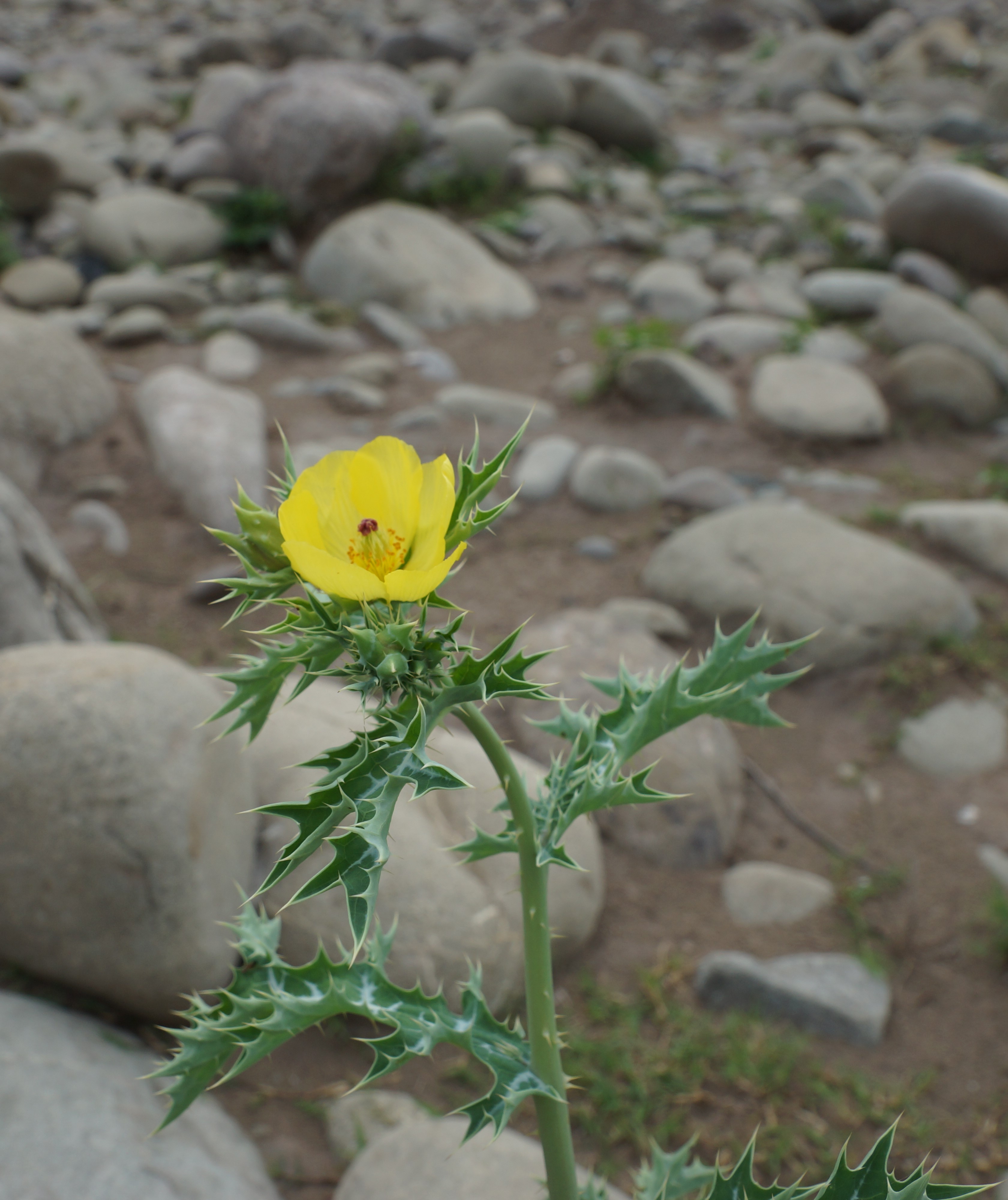 Leaves alternate, elliptic-oblong, pinnatifid, variegated green and white, dentate, margin prickly. Inflorescence terminal, solitary. Flower sessile, yellow, 3-6cm in diameter. Sepals prickly outside. Petals 4-6, obovate, bright yellow. Fruit a capsule, oblong or elliptic-oblong with ribs, prickly, blackish brown, dehiscing by valves.