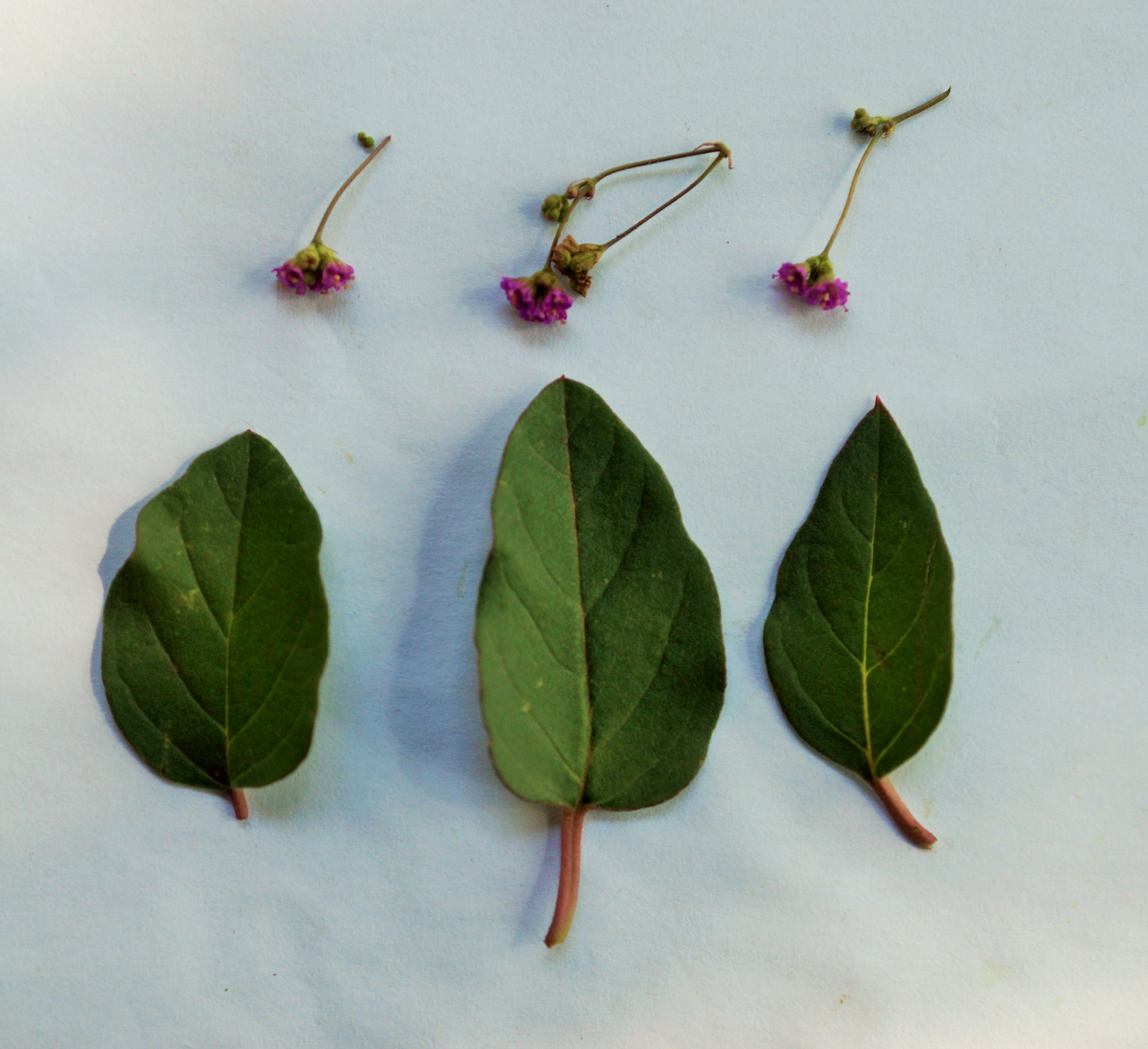 Stem and branches reddish. Leaves simple, ovate to oblong, margin wavy, whitish on undersurface. Inflorescence in axillary panicles. Flower pinkish-mauve, 3mm long. Fruit club like, 5-ribbed, glandular and papillose.