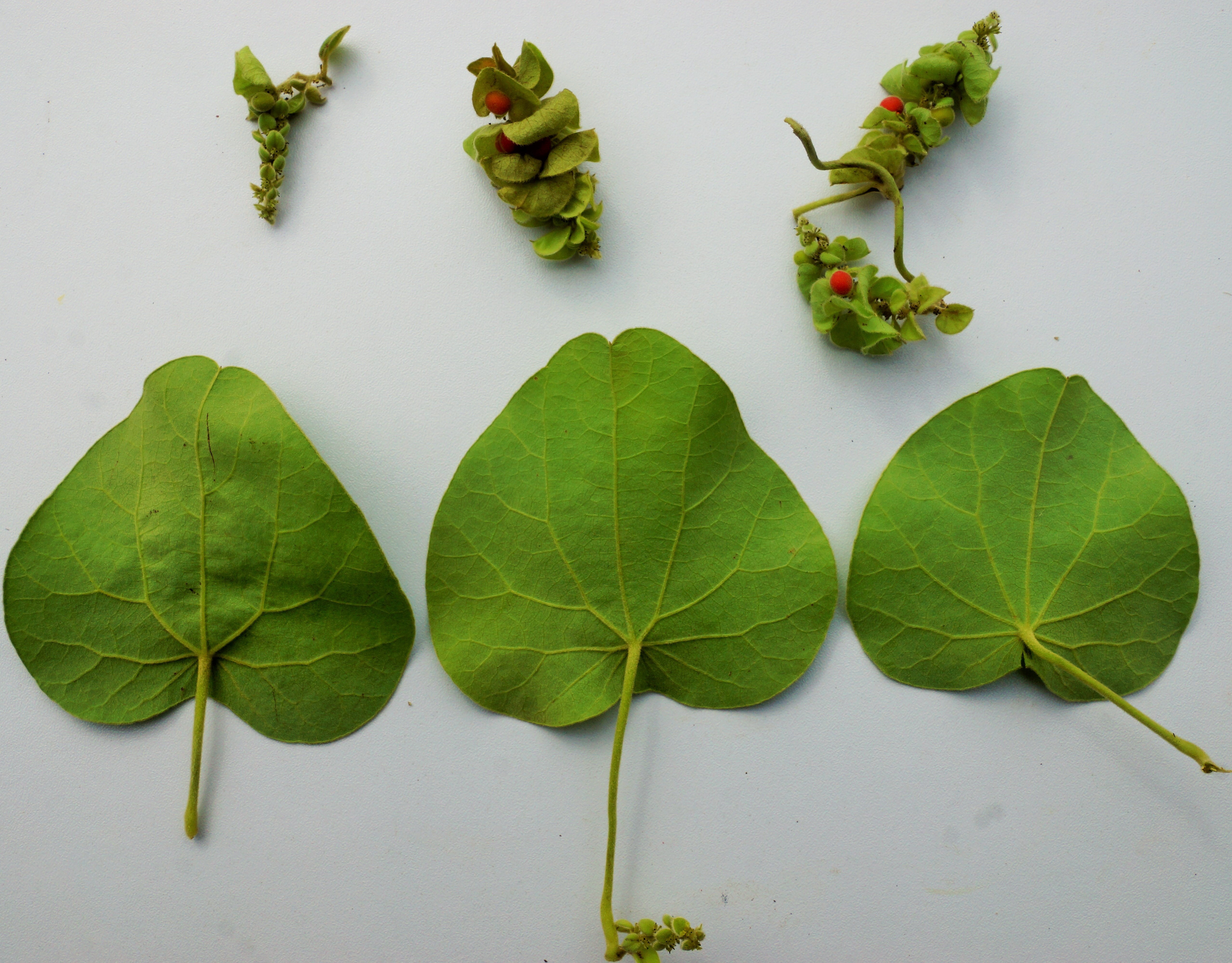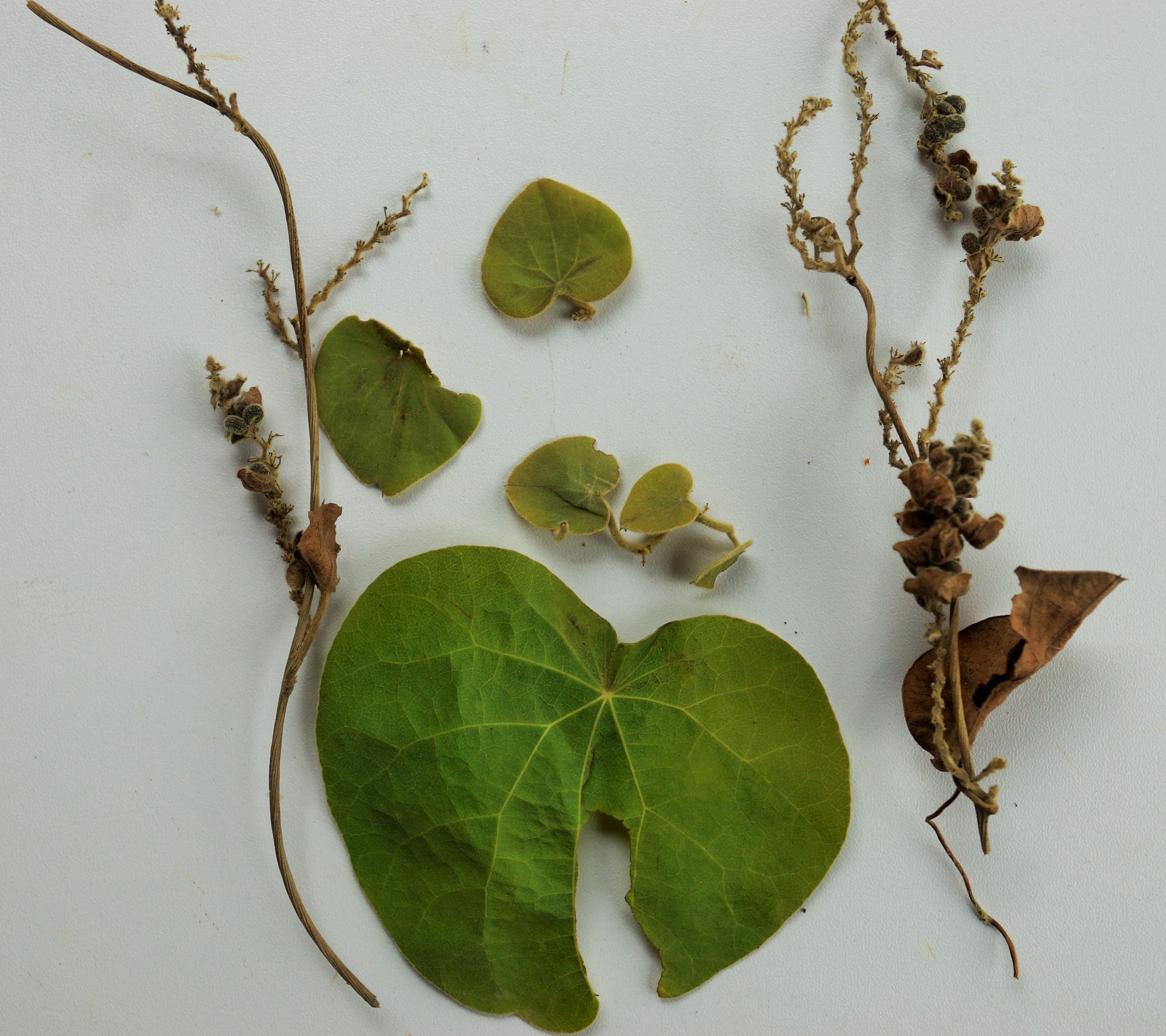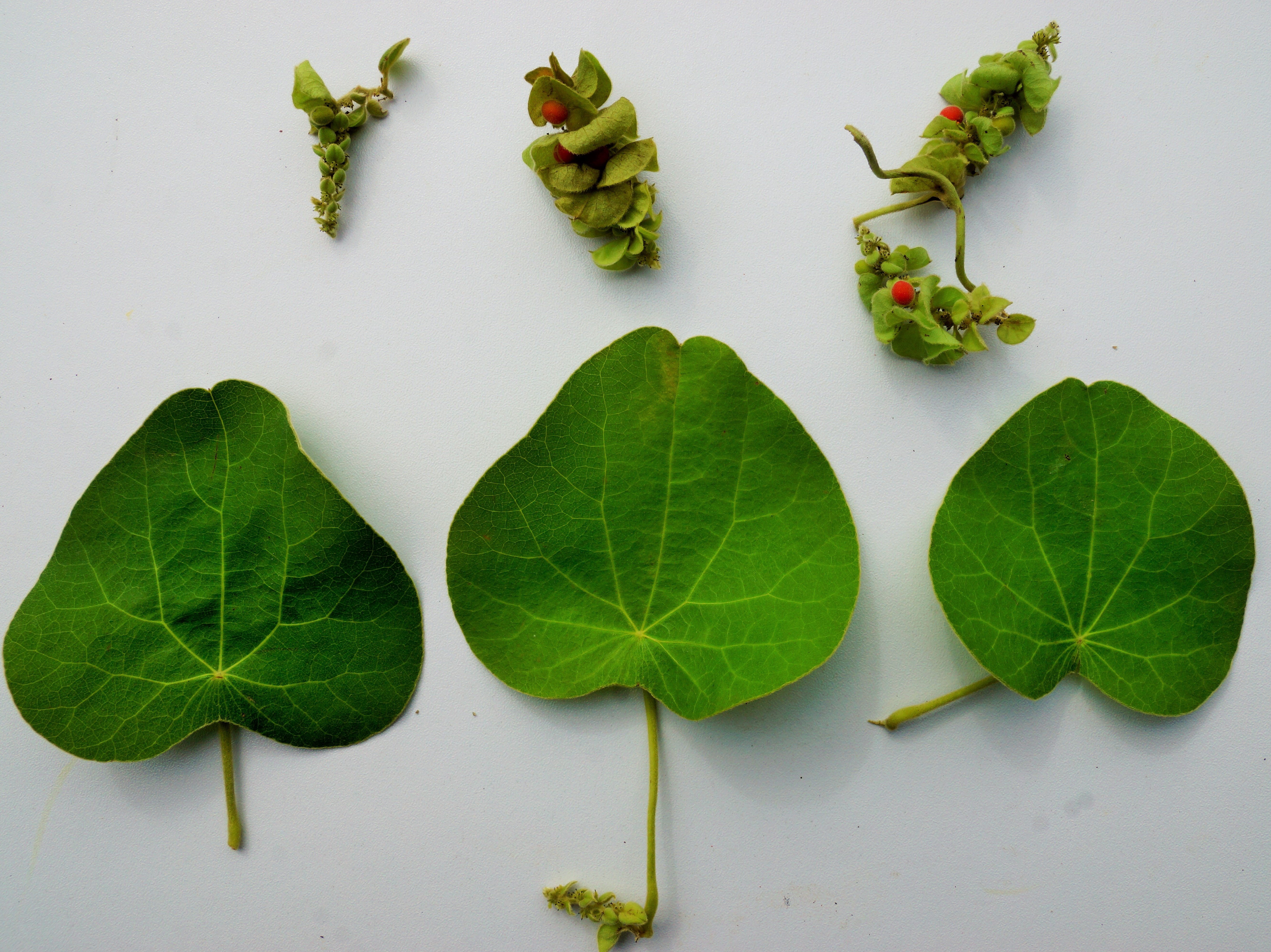 A hairy, slender climber, found in sub-tropical and temperate zones. Leaves simple, peltate, base cordate, hairy on both sides. Male flower in pedunculate cymes. Female flower clustered on 5-10cm long racemes. Flower minute. Fruit a drupe, red when fresh, become black on ripening. Seed horseshoe-shaped.