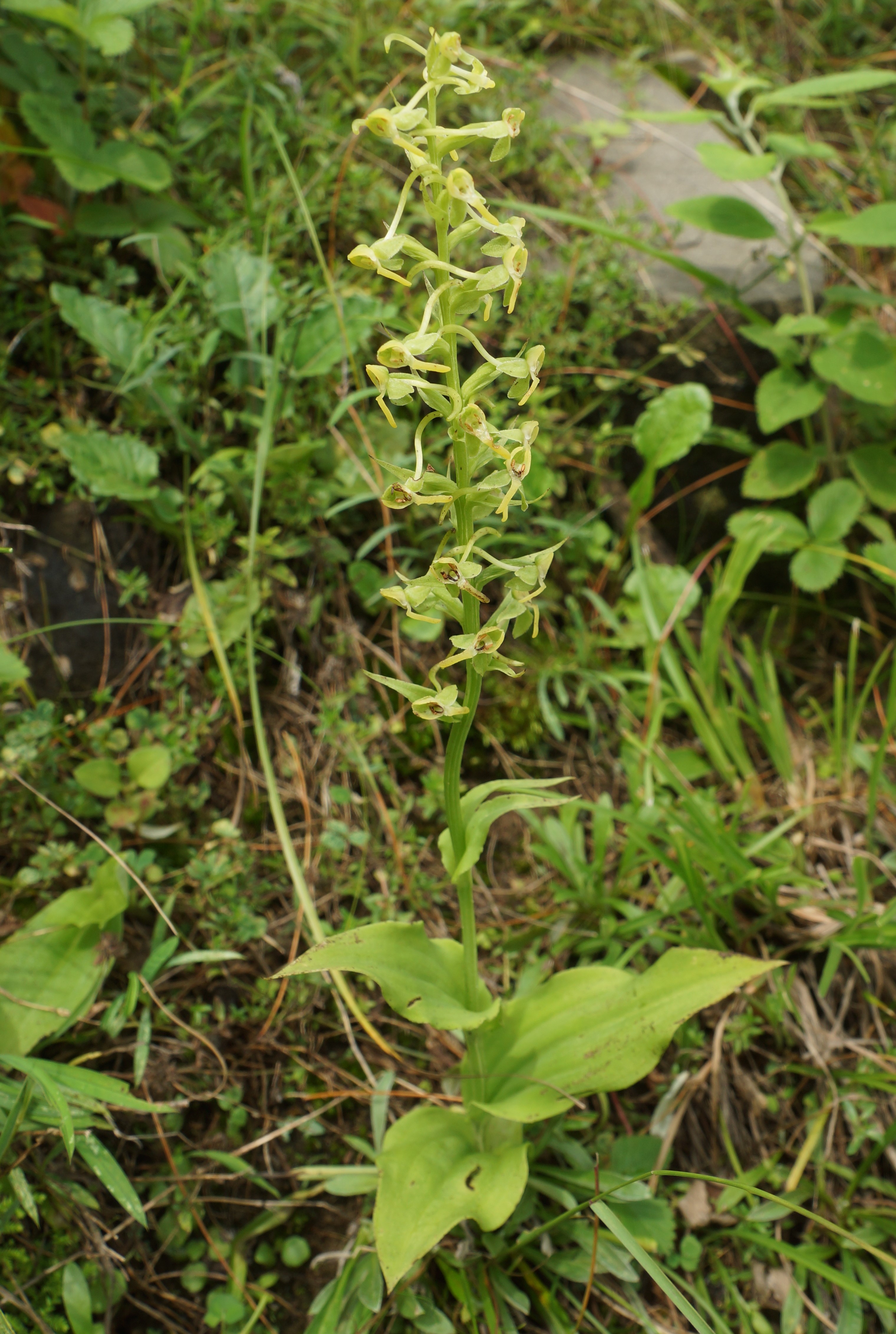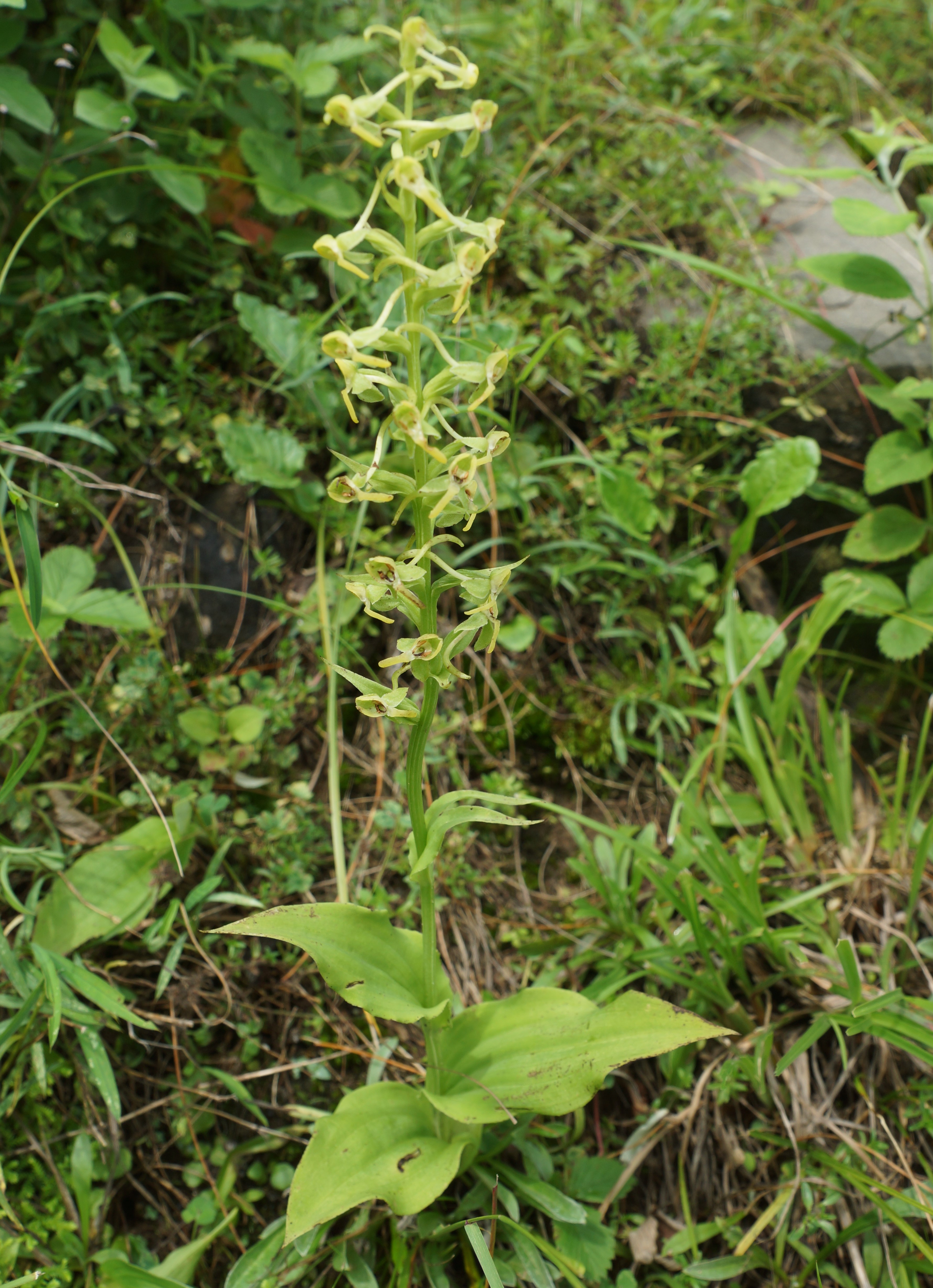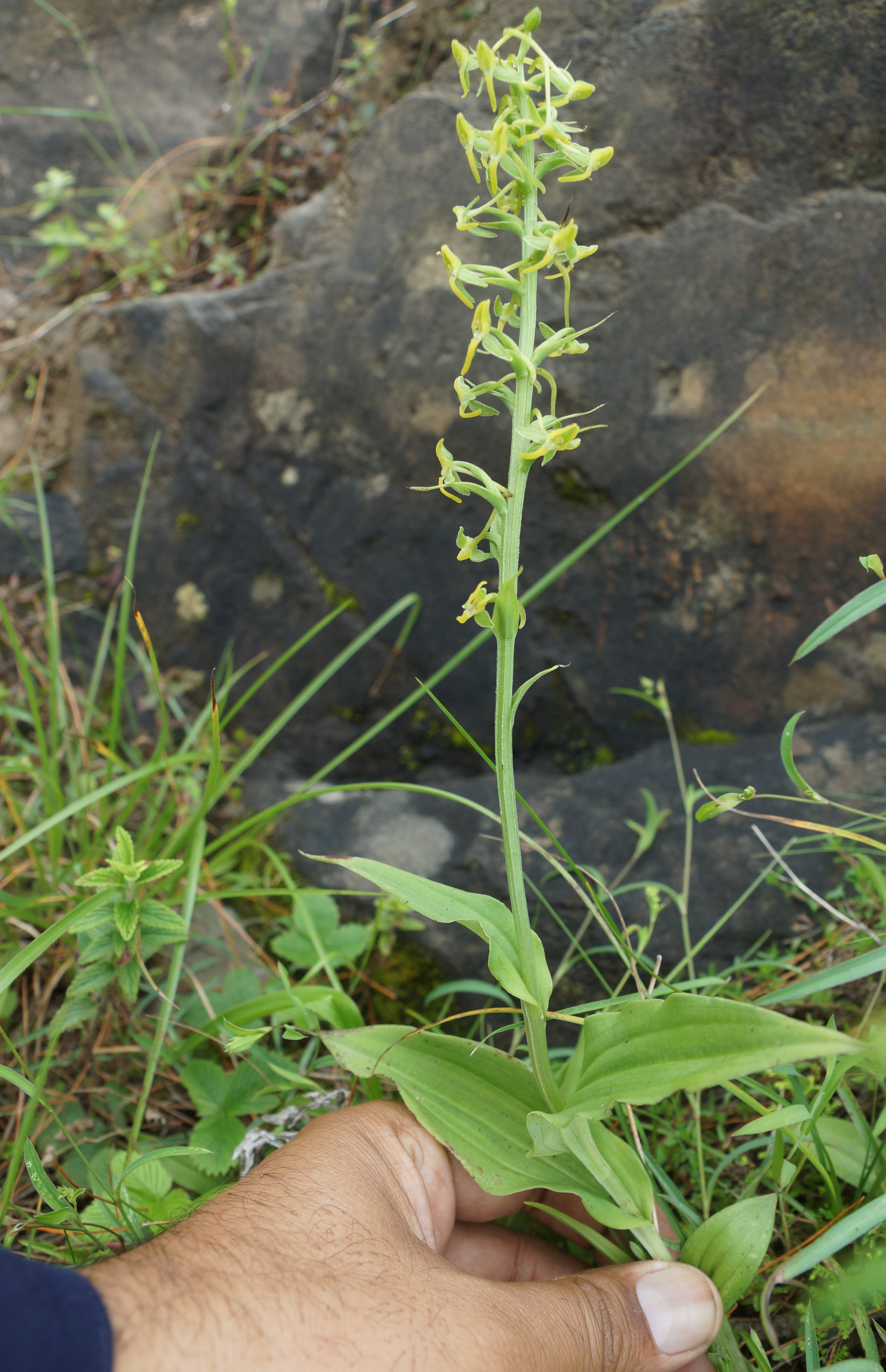 Tuber sessile, ovate-oblong. Stem slender, leafy. Leaves simple, oblong with acute tips. Inflorescence a spike, up to 18cm long. Flower zygomorphic, green-yellow. Sepals dark green. Dorsal sepals broadly ovate and lateral ovate or oblong, spreading or deflexed. Petals yellowish-green, glabrous, spreading, curved inward. Spur slender, deflexed. Fruit a capsule, fusiform.