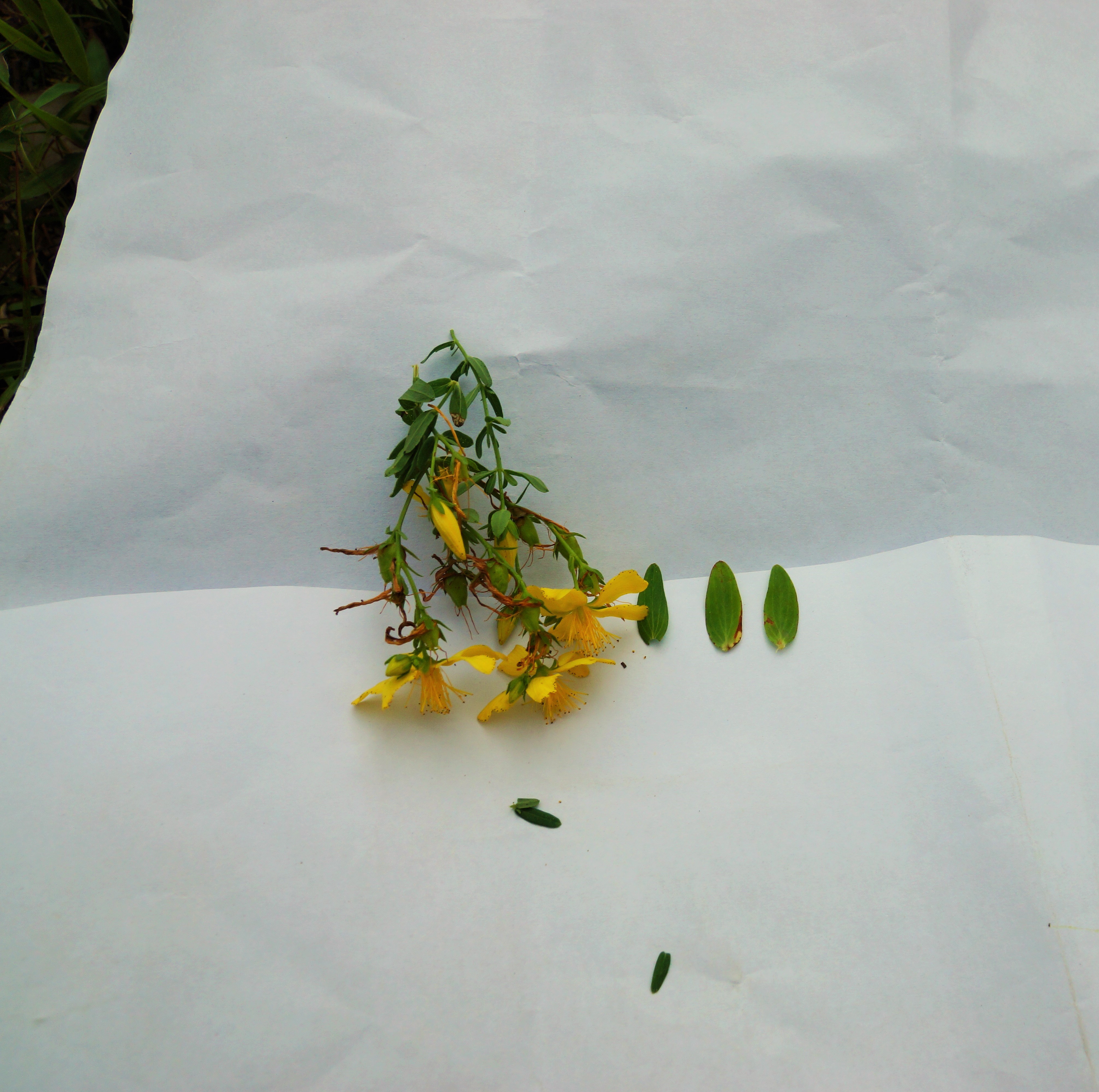 Leaves simple,sessile, ovate to elliptic-oblong, entire, having small oil glands which appear as holes when placed in front of sun, that is why name of this plant is Perforatum means having holes. Inflorescence sub corymbose or broadly pyramidal cyme with monochasial branches, many flowered. Flower actinomorphic, showy, yellow. Sepals lanceolateto oblong or elliptic. Petals lanceolate with marginal black dots. Anthers on rubbing give red color. Fruit a capsule, ovoid to pyramidal.
