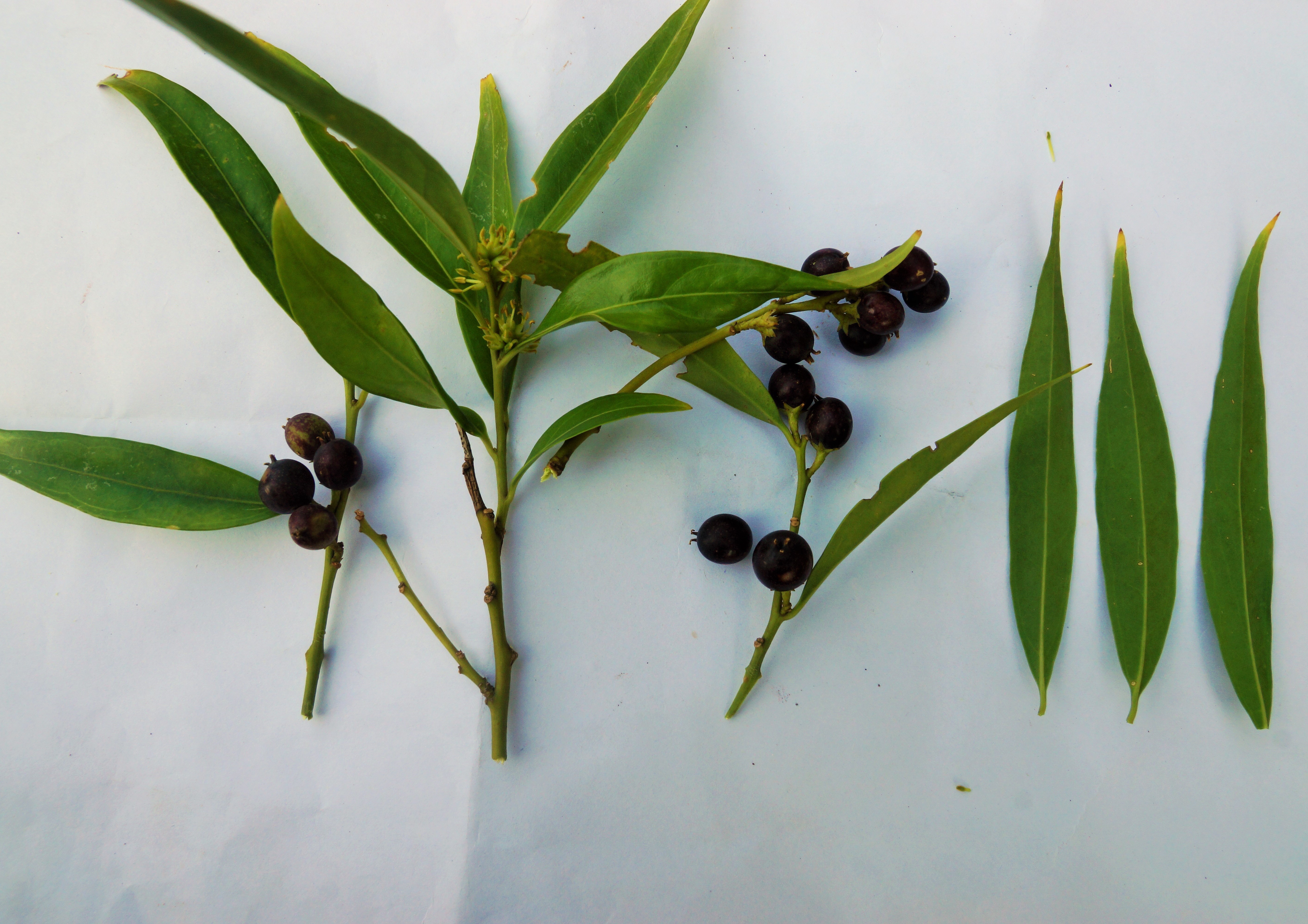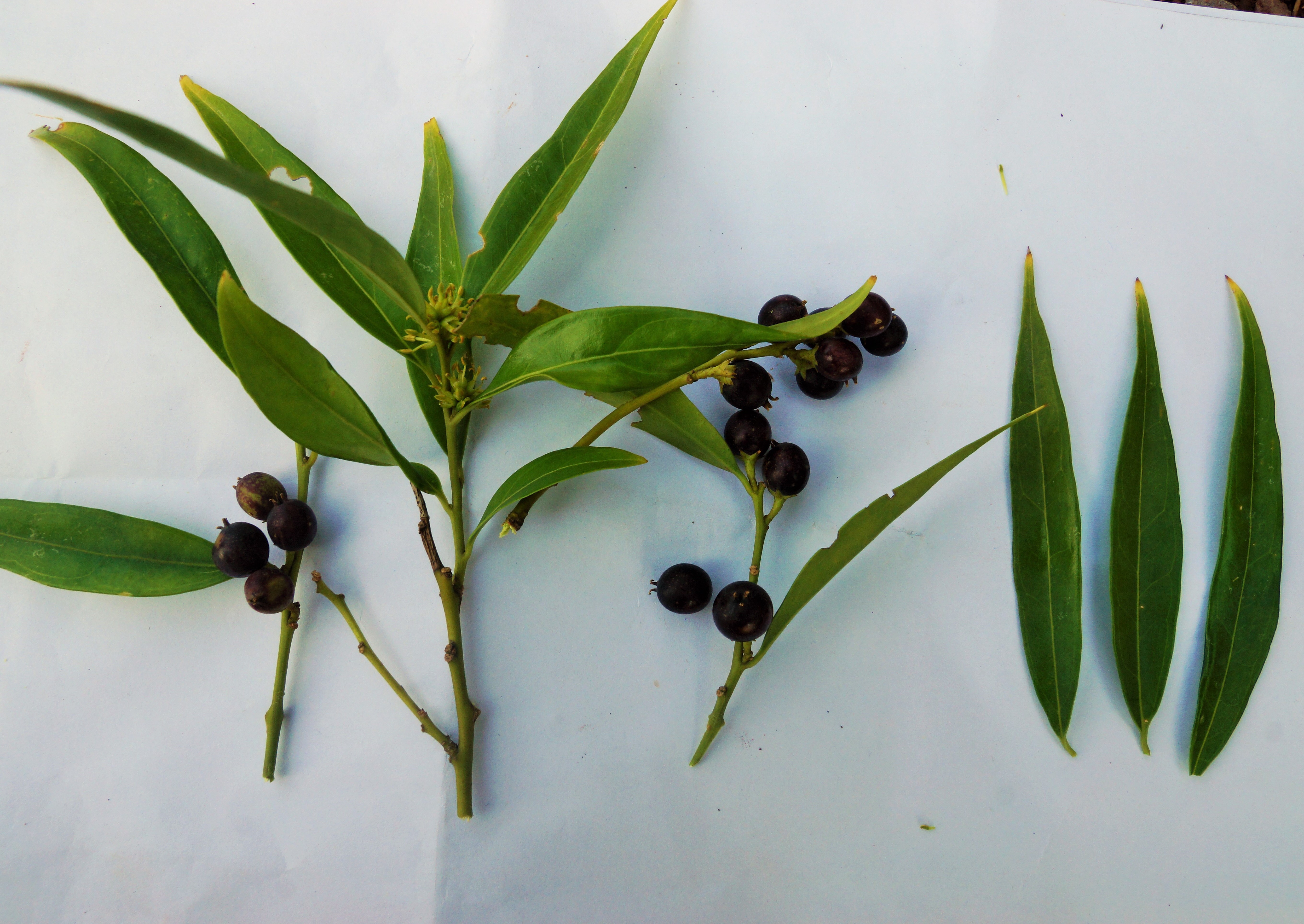 Leaves simple, entire, narrow to broadly lanceolate or narrowly ovate, acute, shiny, upper surface dark green, lower surface whitish green. Inflorescence a raceme, either male or female or mixed, with male flower towards apex and female towards base. Male raceme 6.8 mm long while female 1 cm long. Flower sessile, greenish white, unisexual, bract ovate. Sepals elliptic to broadly elliptic. Fruit a drupe, sub globose, purple, smooth.