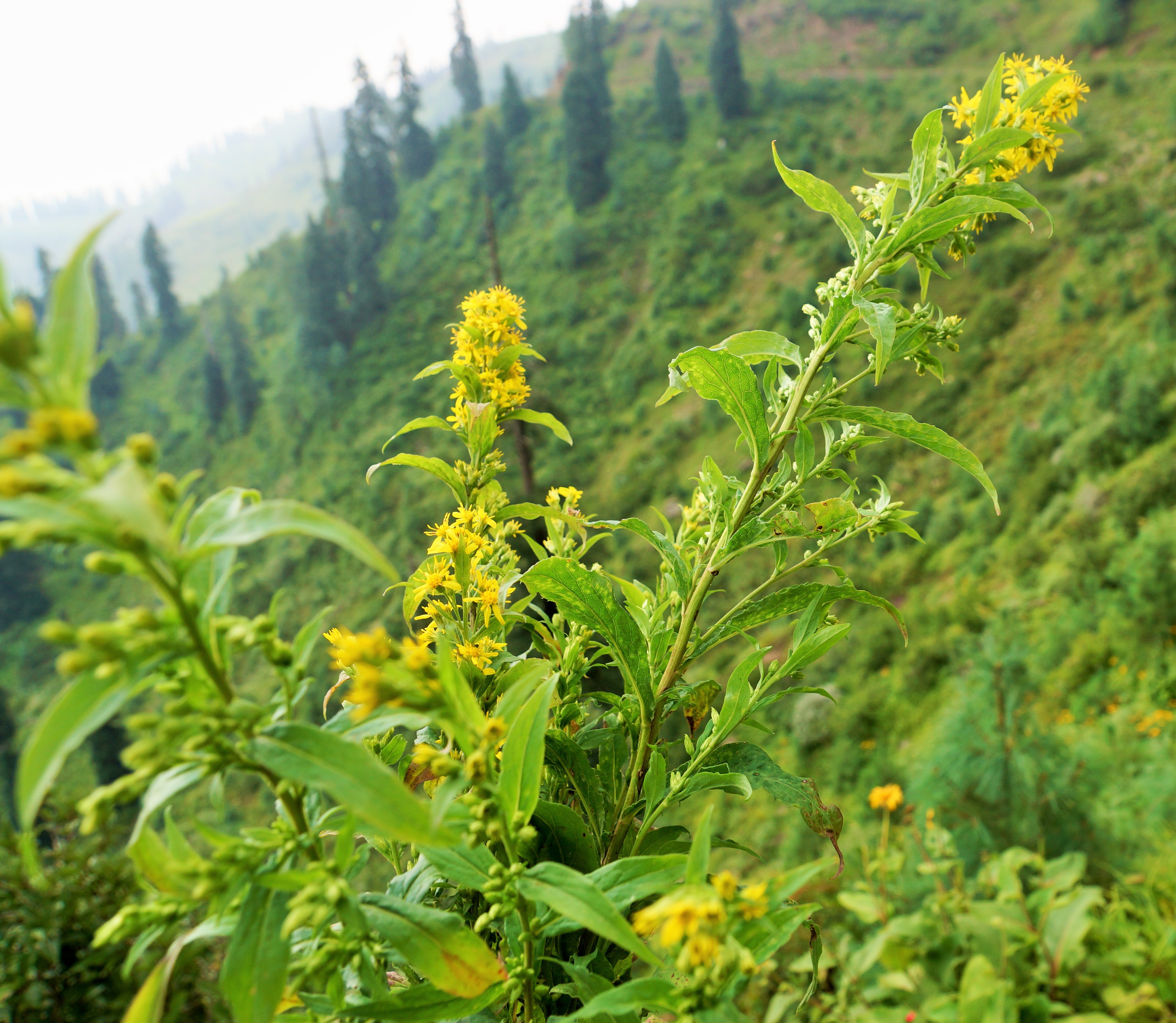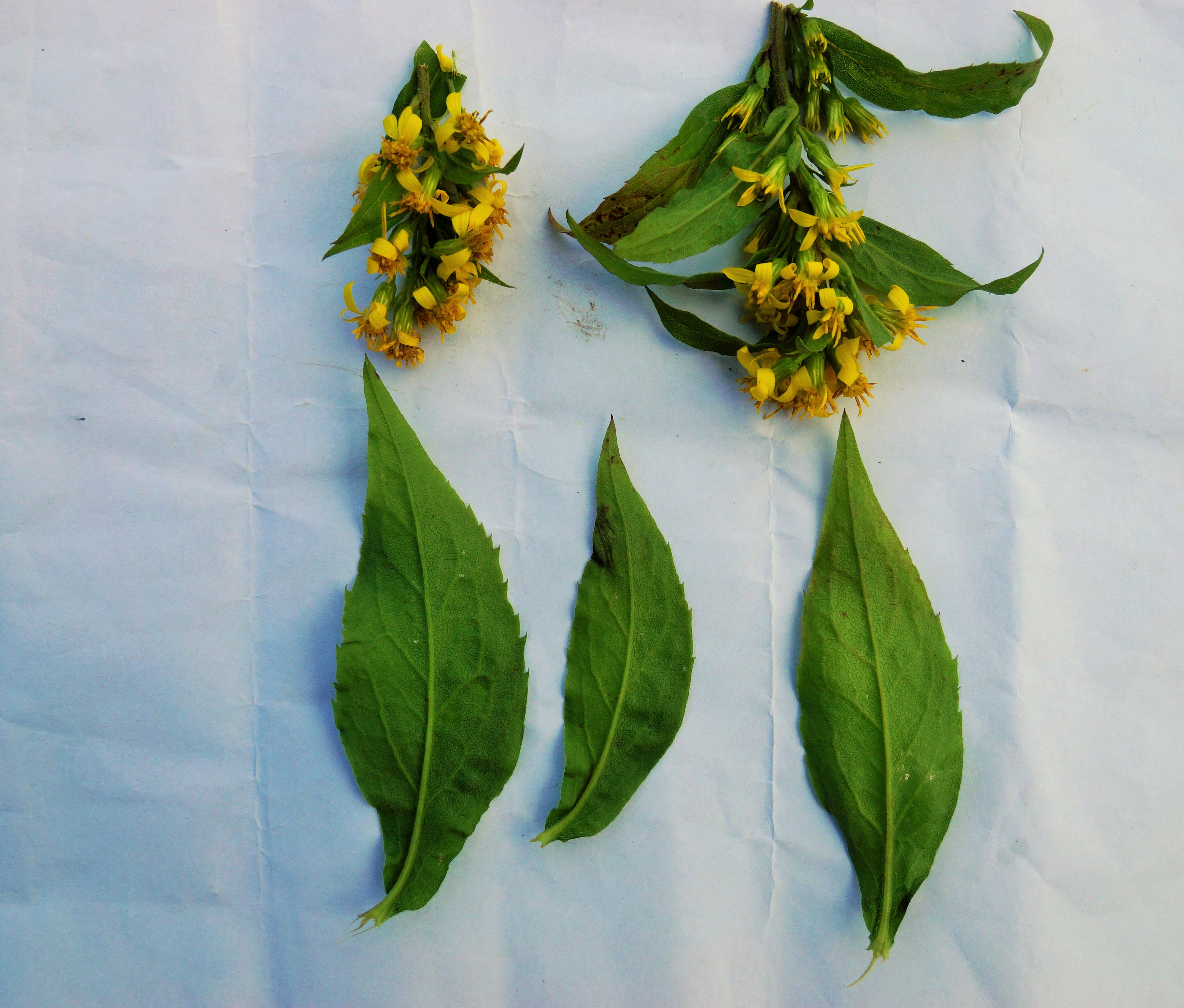 Leaves simple, lanceolate, aromatic, acute, subglabrous, lower leaves stalked, 8-13cm, toothed, the upper sessile, smaller, narrower and entire. Inflorescence composed of terminal panicles or racemes. Flower mustard yellow. Ray floret strap-shaped, spreading while disc floret tubular. Fruit an achene, pappus long, rough with brownish-white hairs.